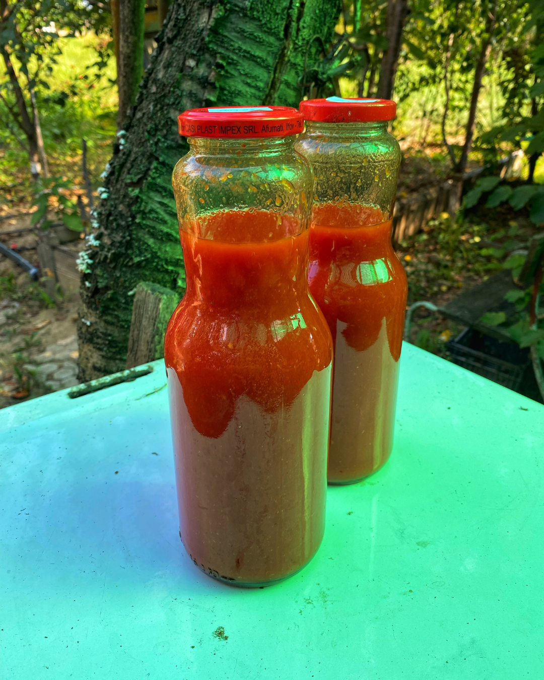 Roșiile noastre cresc și afară, și la scut, adică în seră. În afară de asta, nu punem nimic în sosul nostru, sau bulion, decât un praf de sare. Gustul e 100% divin. Bulionul merge băut gol, asta pentru că are puterea de a te hidrata până la os. Toarnă un capac în omleta de dimineață și amestecă bine. Sau pune un sfert de litru în zama de tășcuțe. Indiferent de cum alegi să îl servești, fie pe stomacul gol dimineața, fie în băuturile preferate de seară, știm noi care, bulionul de casă este licoarea ce nu are cum să-ți lipsească din cămara pentru iarnă și restul anului.