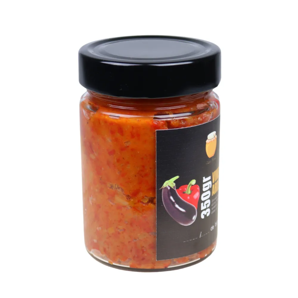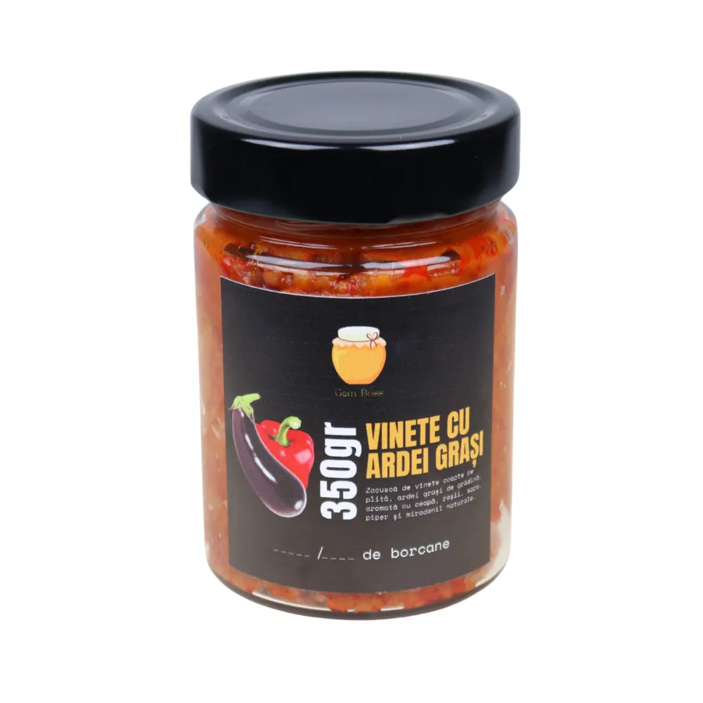 Ingrediente: vinete din grădină, coapte pe plită, ardei roșii 100% ecologici, ulei, sare, piper, mirodenii (5%) și lemn de foc încet.